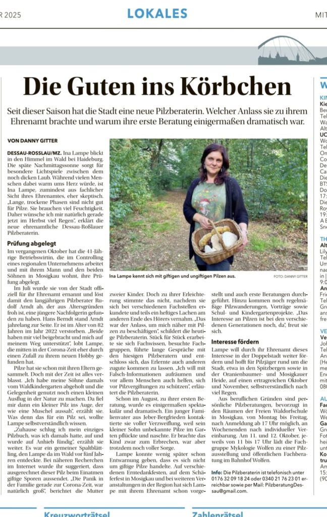 Hin und wieder stehen unsere Pilzberater auch in den lokalen Zeitungen. Hier ein Artikel von Ina Lampe, die das Ehrenamt von Rudolf Arndt übernommen hat und seit Juli offiziell allen neugierigen Einwohnern von Dessau-Rosslau und Umgebung Beratungen und Hilfe rund um das Thema Pilze anbietet.